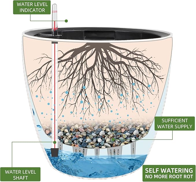 - Self-Watering System: The integrated water reservoir keeps soil moist and aerated, with an indicator to signal when to water again.