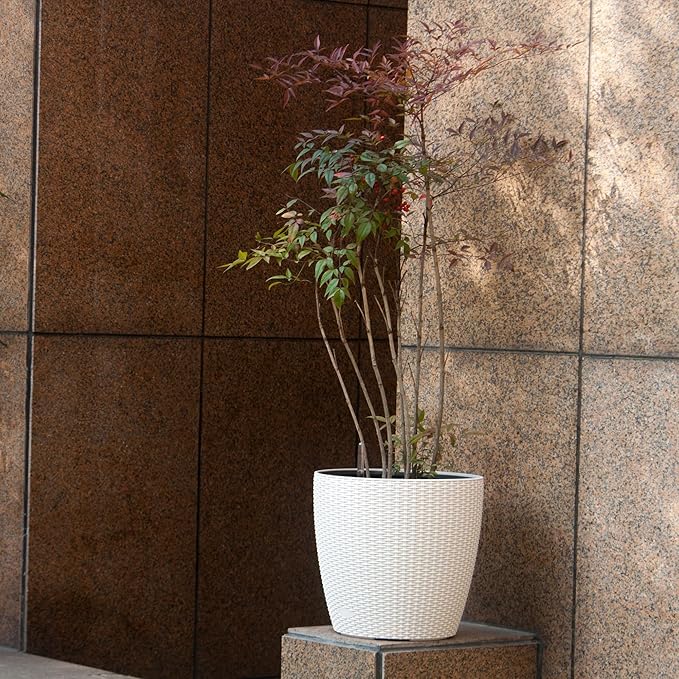 Dexceder 18x17 Inches Rattan Self Watering Planter Indoor Outdoor, Inner Pot Design, Thickened Table Flower Plant Pot with Water Level Indicator (Ivory White)