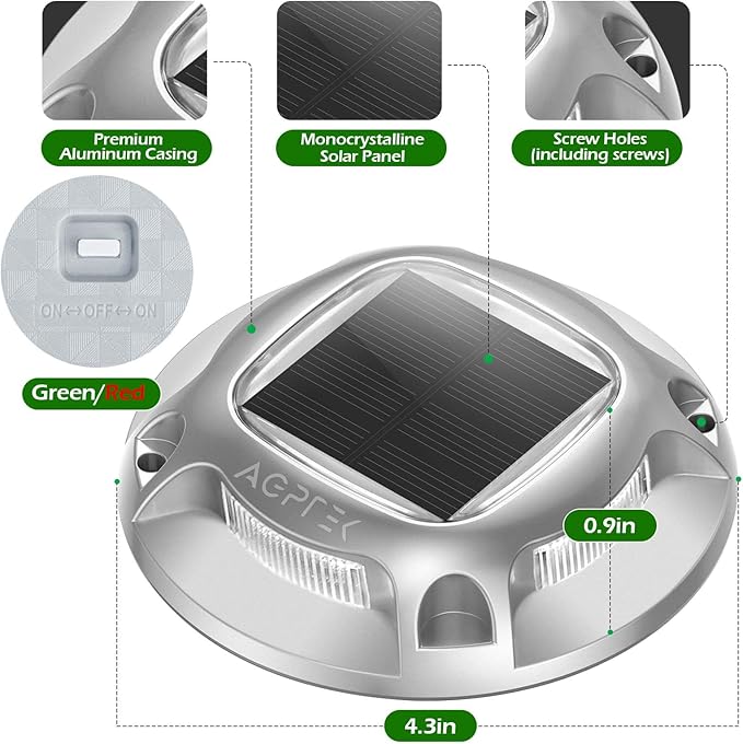 - 【IP68 WATERPROOF SOLAR LED DECK LIGHTS】With an IP68 waterproof design and a tightly sealed battery compartment, these solar driveway reflectors lights can resist any terrible weather, like a rainstorm, or daily heat.