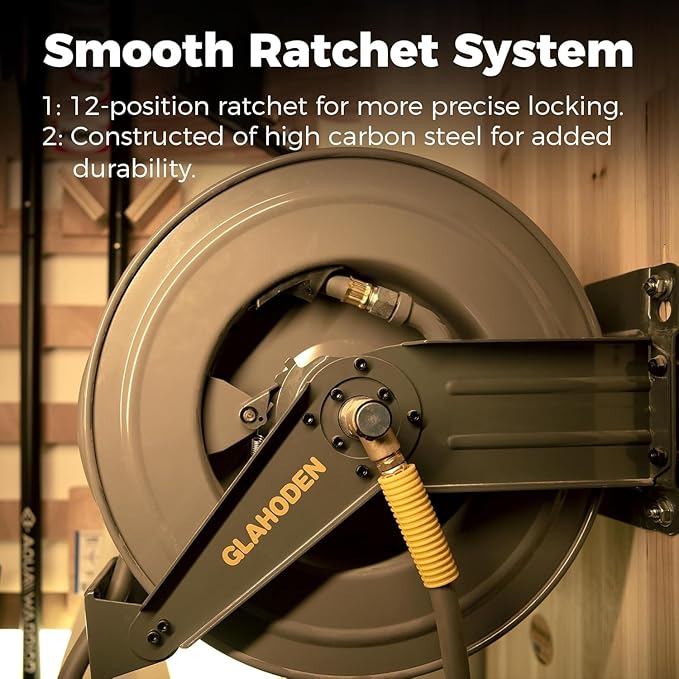 - Heavy Duty Double Arm All-steel Construction: GLAHODEN air compressor hose reel retractable is compact and virtually indestructible by using 0.04 in thickened steel and 0.15 in thick support arm. The high quality powder coated surface is extremely durable and always looks like new (weighs 34.99 lbs, please install on a sturdy surface).