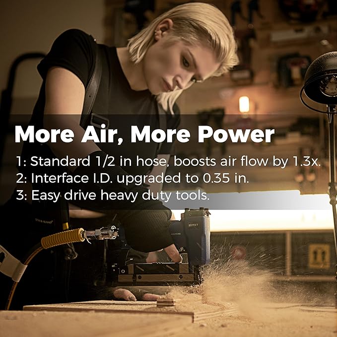 - High Flow 1/2" Hose and 5 Ft Extension Lead: Premium hybrid hose maintains all-weather flexibility (-13 to 113 °F). 0.3 in double-layer hose wall withstands up to Max 300 PSI so it won't kink, flatten, expand and crack under pressure. Swivel brass connectors allow for easy installation, and the orifice expands to 0.35 in which provides 1.3 times the airflow of 3/8 in hose to easily drive heavy tools.