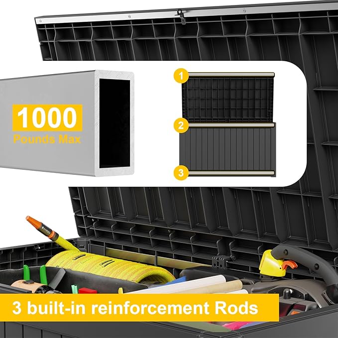 - EASY TO USE: The deck storage box is designed for convenience with built-in handles on both sides, allowing easy lifting and movement. Plus, for added security, you can install a password lock/small lock (not included) on the top cover