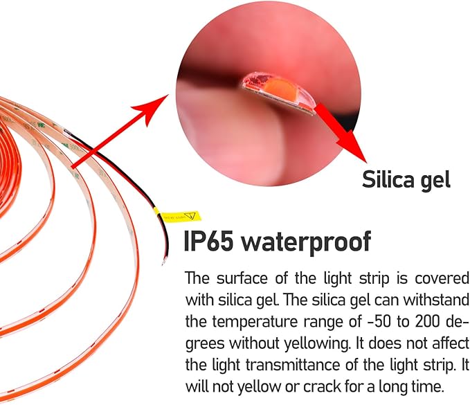 - 【IP65 Waterproof】IP65 waterproof LED strip is covered with a layer of silicone, if you need to weld, use your fingers to remove the silicone from the soldering point before welding.