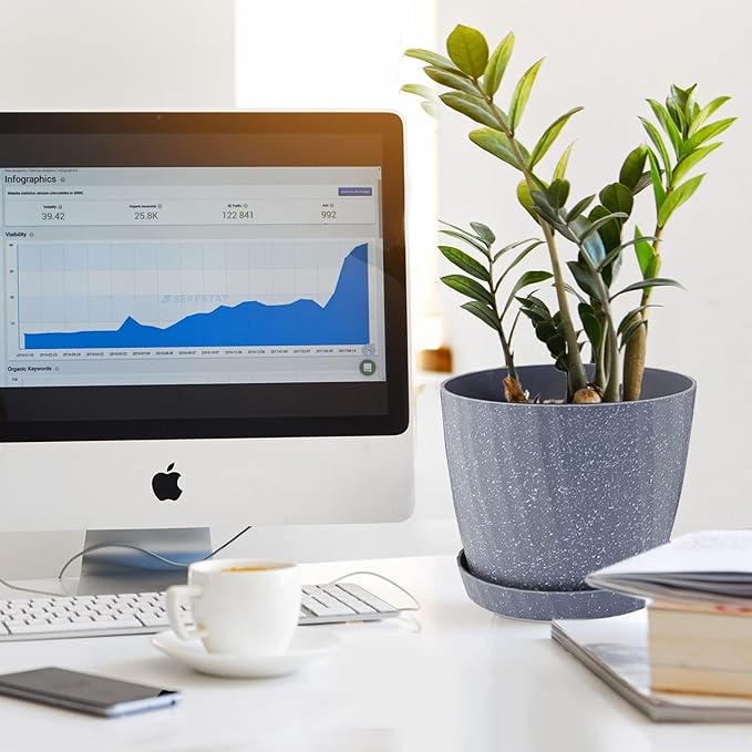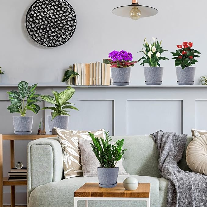 - DECORATION YOUR HOME GARDEN - 6 pack 7 inch planters with grey color, transplant plants to these pots, fill up with mix soil, water and let drain, then place a saucer under each plant. Brings a new stylish home garden. Pefect for hanging up or placed on windowsill, shelf, bedroom, kitchen, office, desktop, garden, etc.