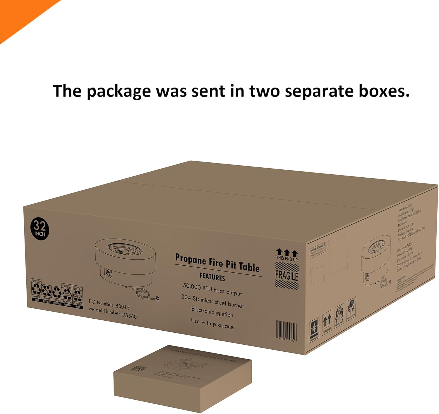 - Natural Gas Conversion Kit - Includes a natural gas converstion kit, which will be shipped separately. Converts propane fire pit tables to natural gas. We shipped the package in two separate boxes, It is possible that one package will arrive before the other.