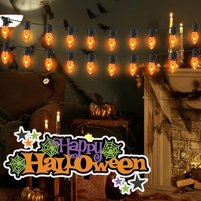 - 🔥Halloween Flame String Lights: Halloween string lights total 25FT with 27 C7 clear orange flame lights (2 spare). 6'' lead with male plug, 12'' spacing between bulbs, 6'' lead with female plug. The C7 Flame bulbs are 1 watt, and E12 bases.