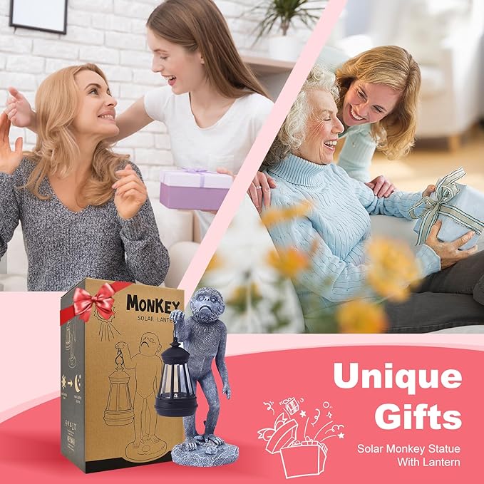 Garden Statue Monkey Figurine - Monkey Decor with Solar Powered Led Lights for Patio Lawn Balcony Yard - Ideal Gift for Women Moms Grandma Housewarming