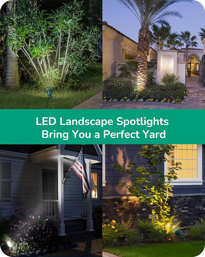 - [5000K Bright & Pleasant Light] Enhance visibility with 5000K white light for roads or lawns, No worry about insufficient brightness or tripping, decorative and safety purposes; green color blends with the surroundings, 4.8W 120V landscape spotlight perfect for palm trees, bushes, flags, walls, gardens, and more