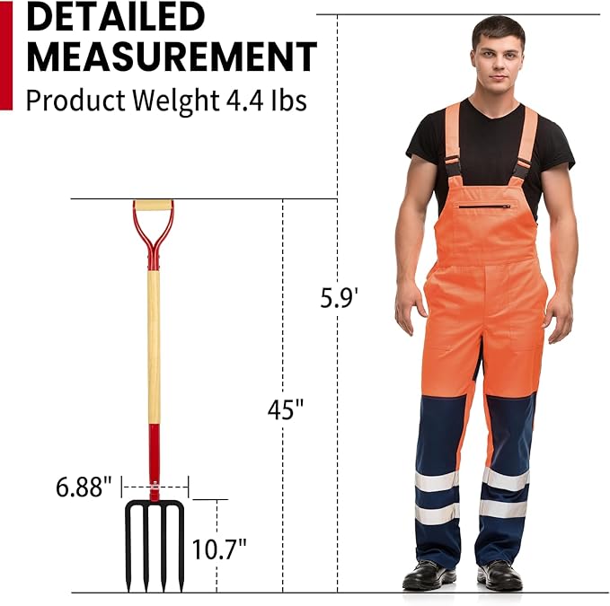 - Dimension: The heavy duty garden fork has an overall length of 45 inches and weighs 4.4 pounds, the ideal length and weight for adult use.