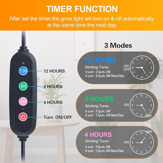 - Auto ON/OFF Every Day---4/8/12 Hr Timer. The plant grow light will auto ON/OFF every day. You can be easy to use this indoor grow light for bonsai, vegetables, seed starting, seedlings, flowering.