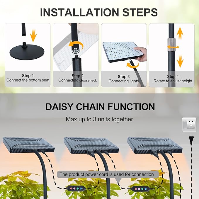 - Daisy Chain Function---You can connect multiple plant growing lights together by the power cable but only need one home socket.