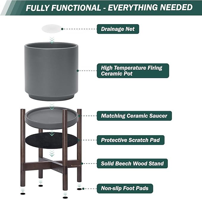 - A Complete Set: Mid-century ceramic planter, combined with a sculptural, solid wood stand that match perfectly together and looks great in anywhere.
