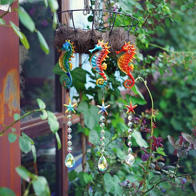 - ⭐Exquisite Crystal Prisms Suncatcher: This suncatcher set includes three stained metal seahorse with starfish designs, adding a touch of coastal charm to your space. The intricate details and vibrant colors make them visually appealing and eye-catching.