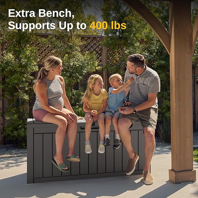 - 𝗥𝗢𝗕𝗨𝗦𝗧 & 𝗦𝗧𝗔𝗕𝗟𝗘 𝗗𝗘𝗦𝗜𝗚𝗡: Support up to 400 lbs. Reinforced with metal rods and internal supports, providing 30% more strength. Thicker (0.08") material and precise assembly reduce warping, making the patio storage box more stable