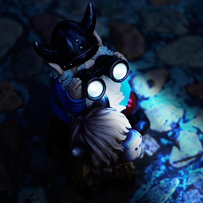 - 【Cute Gnome Decor】Add your outdoor yard the warm mysterious atmosphere at night with this adorable garden gnome and highland cow. Fully charged under the sun for 6-8 hours, will glow for about 8 hours. Size: 6.8" x 5.5" x 9"
