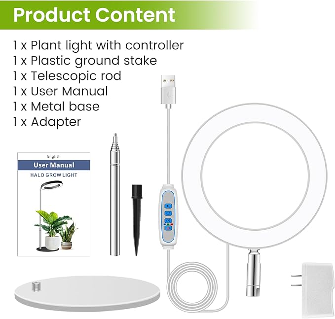 - Multipurpose Halo Plant Light: Our indoor plant light comes with a metal base and plastic ground stakes, 2 installation methods to suit different scenarios, making it easy to use on various surfaces such as desktops, countertops, or floors
