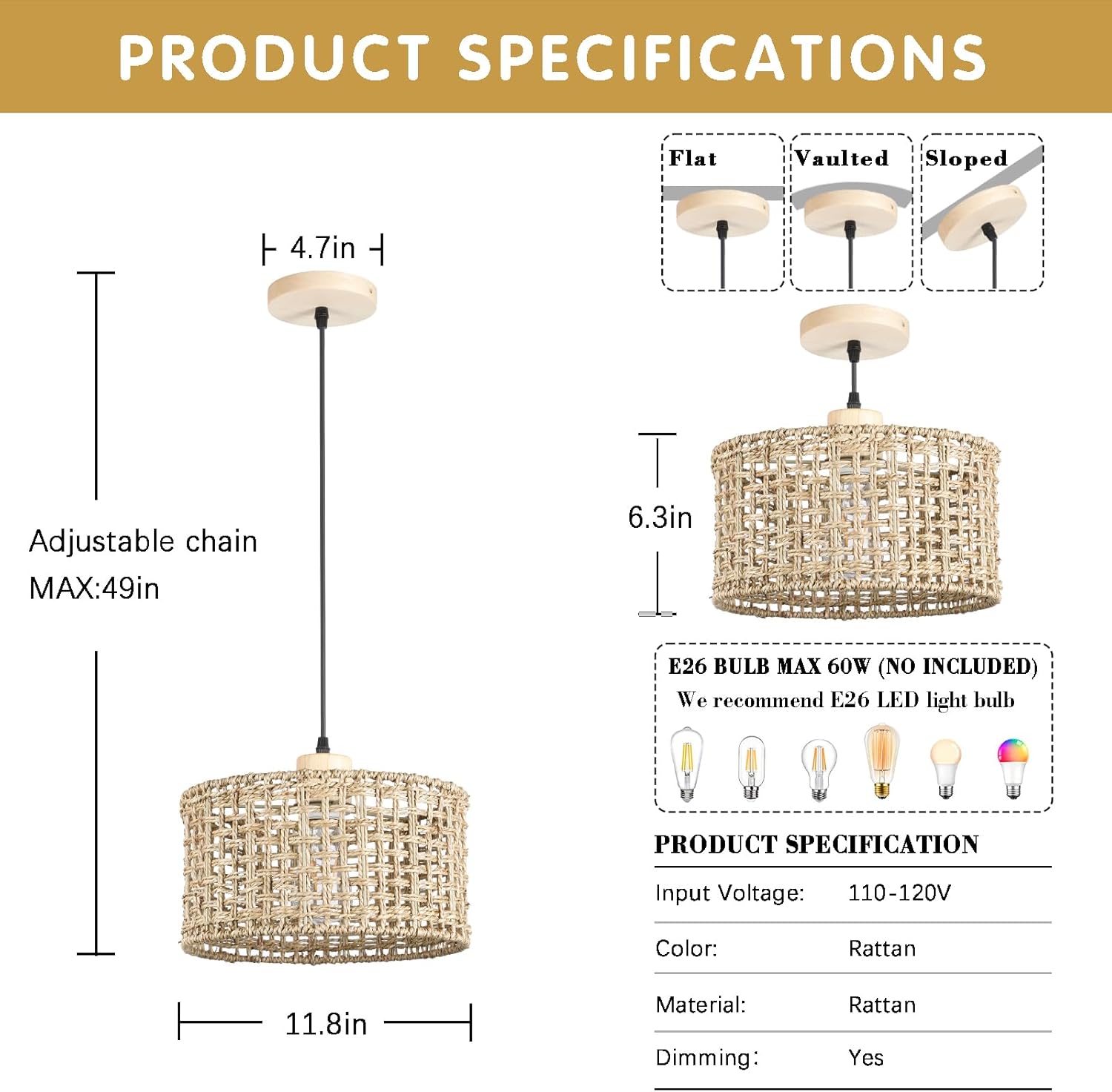 - ⭐【Easy installation】This hanging light apply UL Listed E26 standard sockets (Max 60W), compatible with incandescent, LED, CFL, and halogen bulbs (Bulb Not Included). The light fixtures ceiling hanging includes all installation accessories. Easy to assemble and use, makes your life much easier.