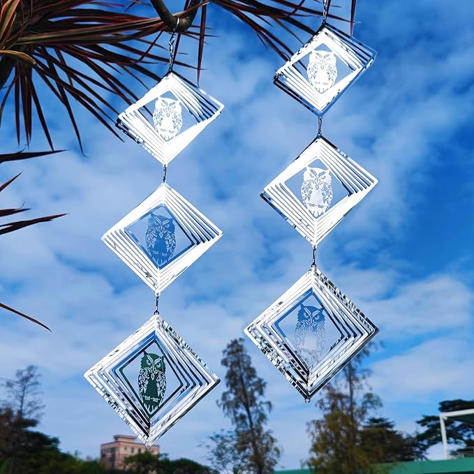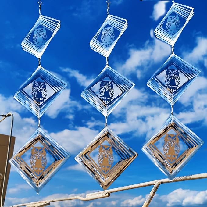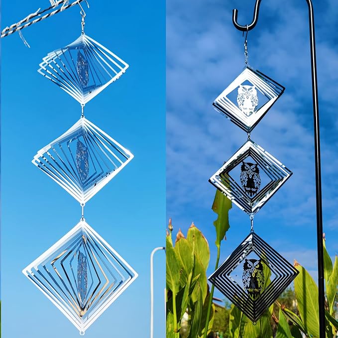- These are 9 swivel hook and 9 square discs owl bird scare of very shiny reflective matel wind spinners can rotate easily in the breeze, protect your garden, farm, and lawn by creating a bright flash that scares away birds.