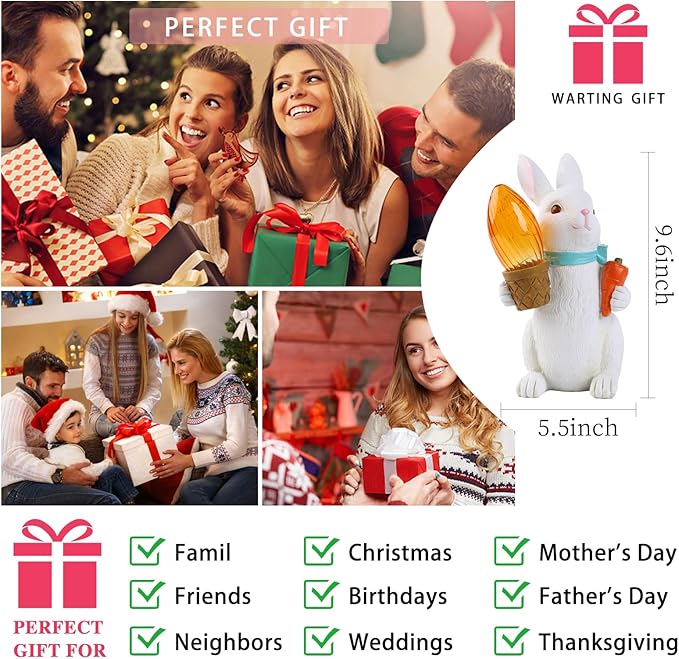 • 【Unique design】This charismatic bunny outdoor decor gracefully holding a solar lantern, adds a touch of magic to your outdoor space, casting a warm and welcoming glow. Rabbit statue 5.5"x 6.3"x 9.6" size ensures it becomes a focal point in your garden, pathway, or even on a wide windowsill, leaving a lasting impression.
