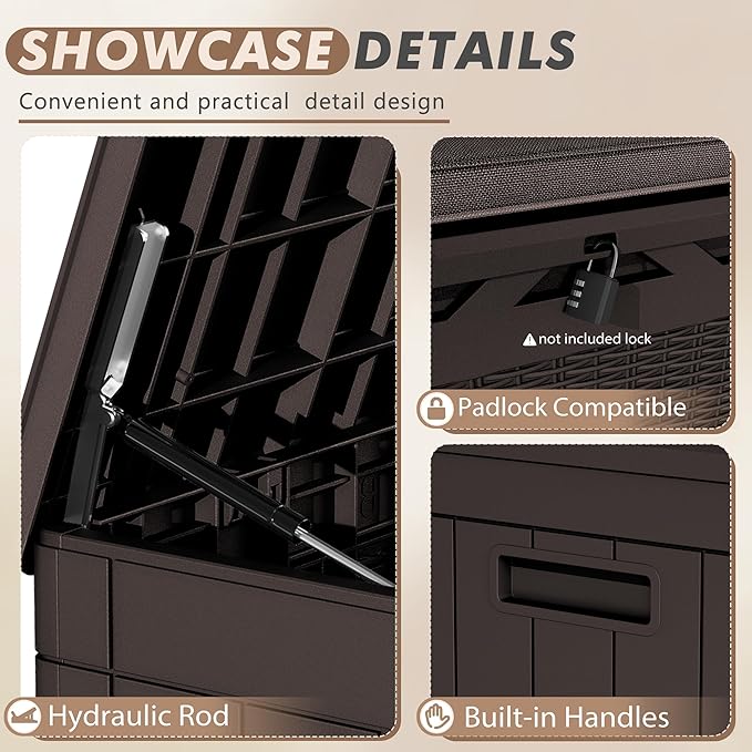 - Extra Bench Cushion: Patio storage box also includes a comfortable cushion for use as a two-person bench. Additionally, the handles on both sides allow for easy mobility, and the hydraulic gas strut design prevents pinching. It is further enhanced with a lockable lid to ensure safety
