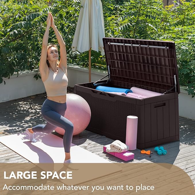 - Durable Resin Material: Deck box is made of waterproof resin, with a complementing rattan pattern design, effectively preventing fading and rusting, while also maintaining a fresh appearance even with all-weather use