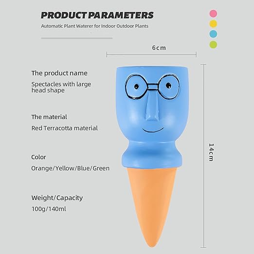 - Perfect and economical choice--The package includes 4 watering stakes.The size of one spike is 5.5” long and the weight for one spike is 3.52 oz.Cute big head glasses design.These plant watering devices not only provide functionality but also add a touch of charm to your planters.