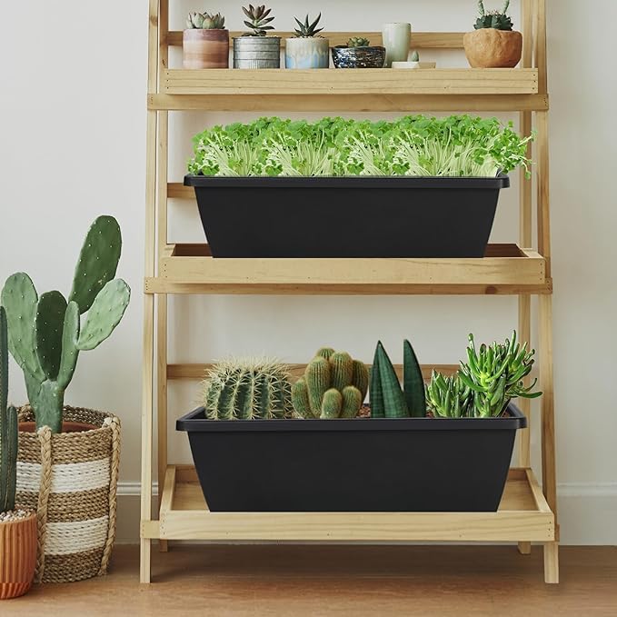 12Pcs 17Inches Rectangle Planter Box with Drainage Holes and Trays Plastic Planters Flower Boxes Pots for Indoor Outdoor Plants Patio Garden Home Decor Porch Yard (Black)