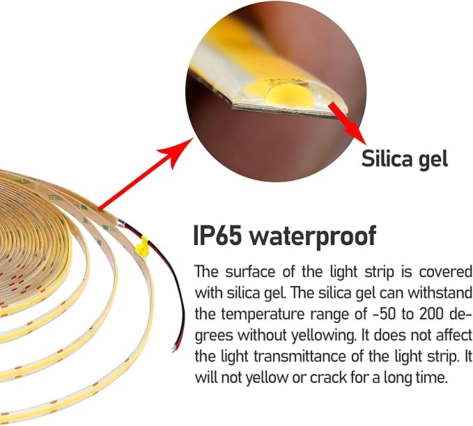 - 【COB LED STRIP】384LEDs/M(3.3ft), 5760LEDs/49.2ft(15M), COB light strips have more dense LED chips, Which make the emitting units nprecedentedly close to each other, and create super even lighting performance. At the same time, it brings higher luminous efficiency.
