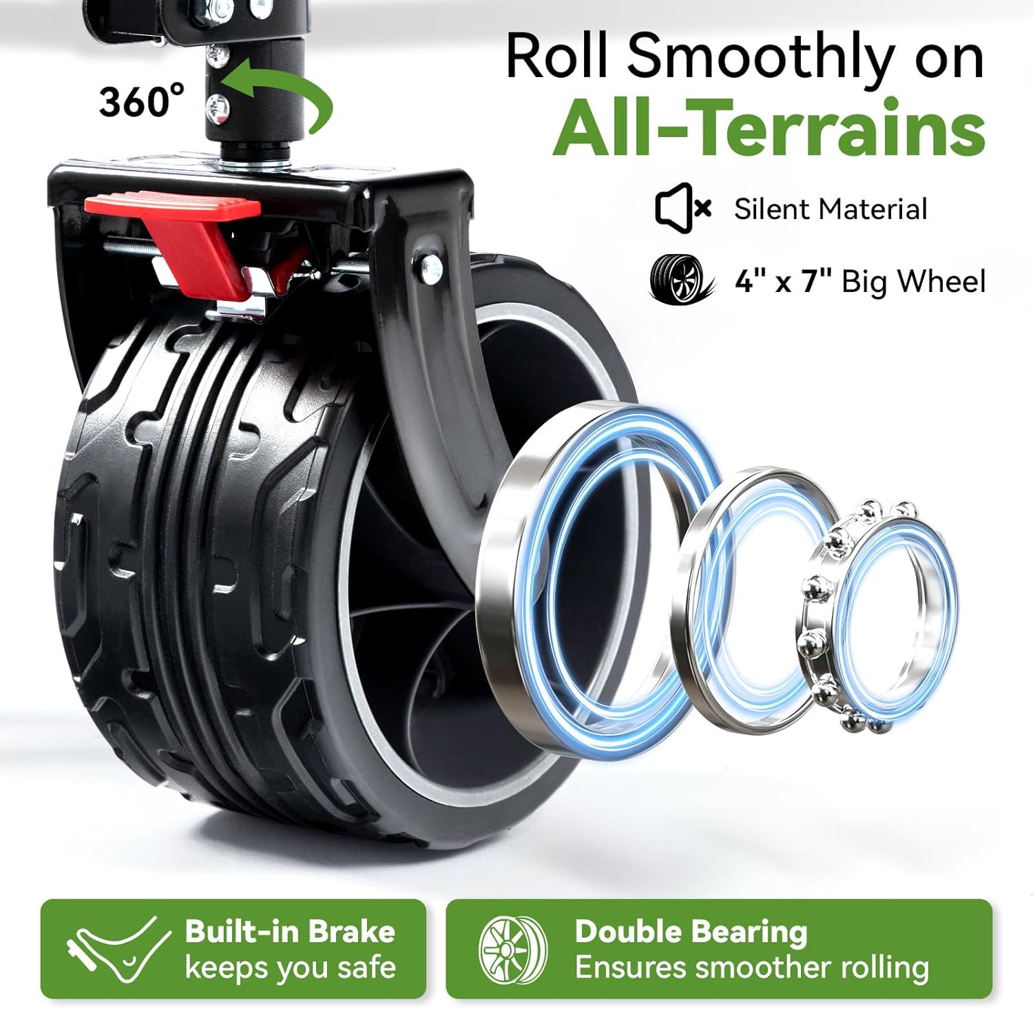 - 𝐖𝐈𝐃𝐄𝐑 𝐖𝐇𝐄𝐄𝐋𝐒 𝐂𝐎𝐍𝐐𝐔𝐄𝐑 𝐀𝐋𝐋 𝐓𝐄𝐑𝐑𝐀𝐈𝐍𝐒 - Super large 4" wheels with unique anti-slip pattern make our collapsible wagon extremely capable of transporting load on multiple terrains, including sandy beach, grass and even rough terrains. The wheels of our beach cart are significantly wider than similar folding carts, resulting in dramatically better steering. The dual front wheels are 360-degree rotatable for easy maneuvering.