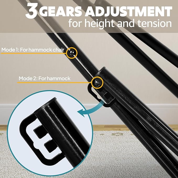- Easy to Assemble :Hammock stand can be easily set up or take it down in just a few minutes without tools. Removable screw design, with the adjustable hooks on the stand, you can decide how low or high the hammock to swing.Both backyard and portable hammock stands are easy to set up and hang your hammock from. And you don’t need to measure the distance between anchor points.Free yourself from head to toe and enjoy the fun of the hammock stand.