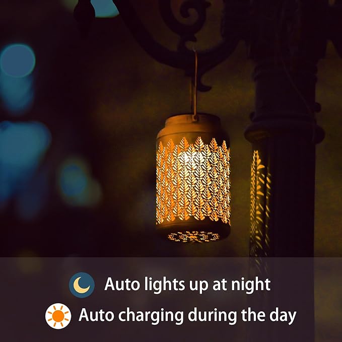 - Imaginative Garden Decor - Eandisom Outdoor Solar Lanterns are crafted from upgraded Sturdy metal, The retro appearance, with gold copper color and hollow out metal veneer, gorgeous color, casts bright and warm light in darkness, accompanied by gorgeous and graceful patterns, adding a beautiful atmosphere to the surrounding environment. Add illuminated charm to a garden, patio, porch and outdoor tabletop with these solar lantern lights. Make your outdoor spaces unique and amazing.