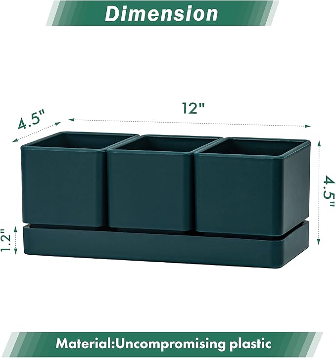 - Dimensions: Set of three herb pots and tray. Each herb box is 4” W x 4.3” H. Tray: 11.8” L x 4.3” W x 1.2” H, great size for planting herbs, vegetables and cactus etc.