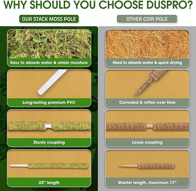 - βπΏππππππππππ πππππππππ ππππππ: When the plant outgrows the moss pole, simply add another poles to provide extra support. This process only takes a minute and you can stack up to 2 poles with 38" tall. Despite its height, Duspro monstera moss pole still remains sturdy and offers strong support that won't lean like other coir poles in the market .
