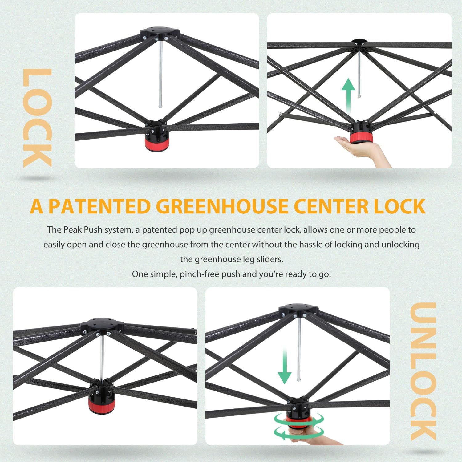 - EASY SETUP: This easy setup pop up greenhouse plant tent features the Peak Push system, a patented greenhouse center lock. The portable greenhouse requires no tools and easily opens and closes from the center in seconds. Its unique greenhouse center lock enables a quick, one person setup, letting you maximize gardening with minimal effort