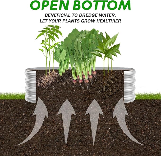 - 【Open Bottom】This metal raised garden bed is designed with an open base. It is good for drainage, and plants roots won't be sick from excessive water. Also, plants roots can absorb better nutrition from the soil, and grow more healthy.