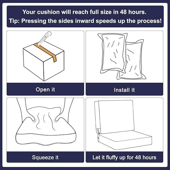 - Size Selection - Set includes a seat bottom measuring 19” W x 19” D x 3” T and a cushion back measuring 19” W x 16” H x 3” T. ( The size description is only for the cushion size, accurately measuring the dimensions of your furniture's seating area in advance, make sure the cushion size fits your furniture ). Slight size variations (±0.5") may occur due to handcrafted cutting. Please allow 48 hours for cushion to fully expand after opening.