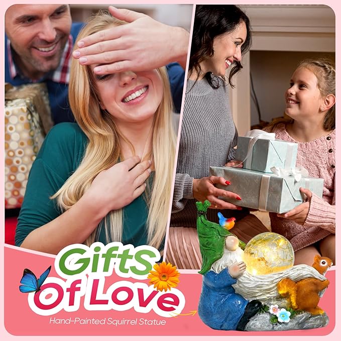- 【Original Solar Gnome Statues 】The adorable elf's beard is mistaken by a squirrel as its own package and prepared to steal the "Large Night Pearl."The garden gnome statue is hand painted with exquisite details, making it a beautiful and eye-catching addition to your garden or home.Place this lovely outdoor garden decor which is sure to bring a smile to your face .
