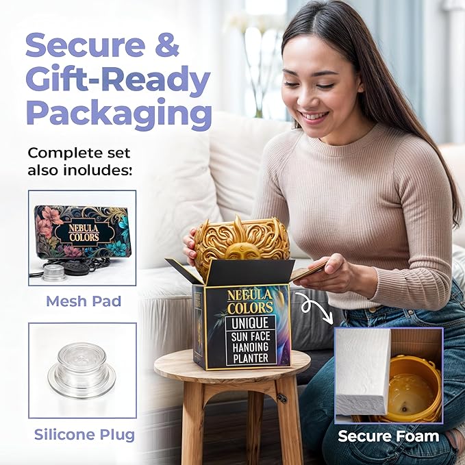- [STUNNING DOUBLE-FACED SUN DESIGN]: Transform any space into a boho paradise with our unique hanging planter. Perfect for indoor and outdoor use, this versatile wall or ceiling mounted pot adds a touch of whimsy to your home, patio, or garden decor.