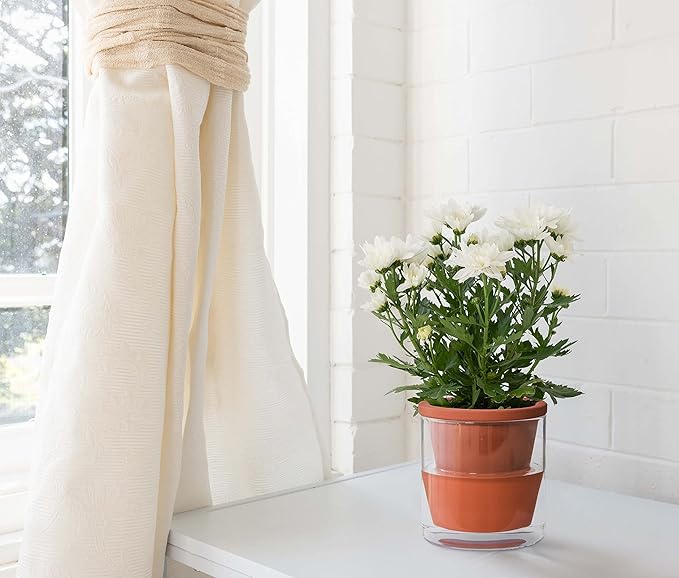 - Innovative Self-Watering Design: Terracotta material is porous in nature, even without the drainage hole, the water will slowly be absorbed by the terracotta pot and then by potting soil, which then provide proper moisture for the plants’ root and water supply. Just fill the glass container with water to cover half of the pot, and it will absorb proper amount of water whenever needed.