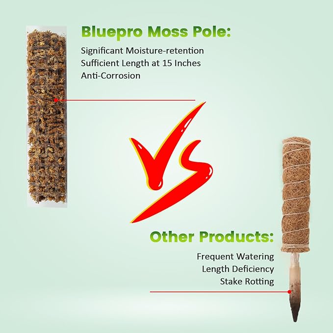 - [Unique Design] Bluepro launched a new slimmer version—15" moss pole to help our customers better grow their small size plants. This moss pole for climbing plants is semi-cylindrical in shape, compared to coco coir poles that are generally cylindrical on the market, and its exclusive flat surface will let your plant's aerial roots to better attach to it.