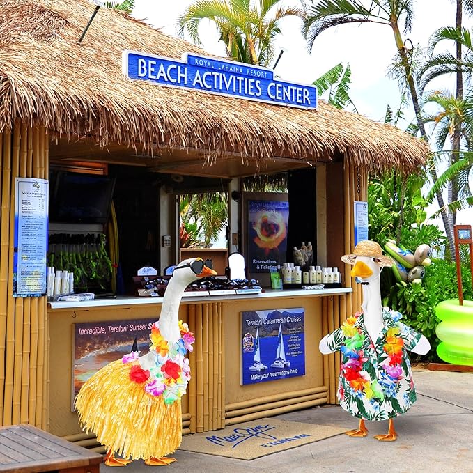 - Convenient Package Inclusion: our 23'' goose outfit package comes with 1 Hawaiian shirt, 1 bikini set (includes 1 hat, 1 bikini, 1 skirt), 1 hat, 1 pair of sunglasses, and 1 Hawaiian wreath; Please note that while the outfit comes with numerous accessories, the lawn goose itself is not included, allowing you to apply it to an existing statue or find one that suits your preferences