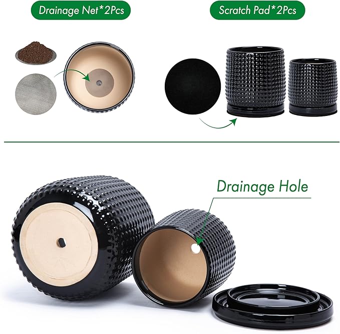 - Drainage Hole & Matching Saucer: Each pot comes with pre-drilled drainage hole and perfectly matching ceramic design tray for small amount of excessive water drain.