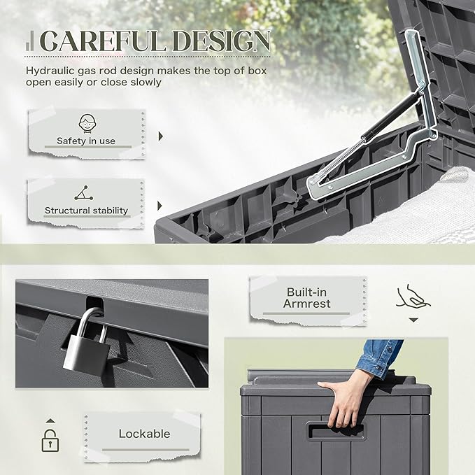 - PRACTICAL DESIGN: The deck box has a hydraulic holder design, which can prevent your hand from being caught when you open and close the box to ensure safety. Meanwhile, there is a support bar designed inside the lid, which can enhance the durability of the storage box.