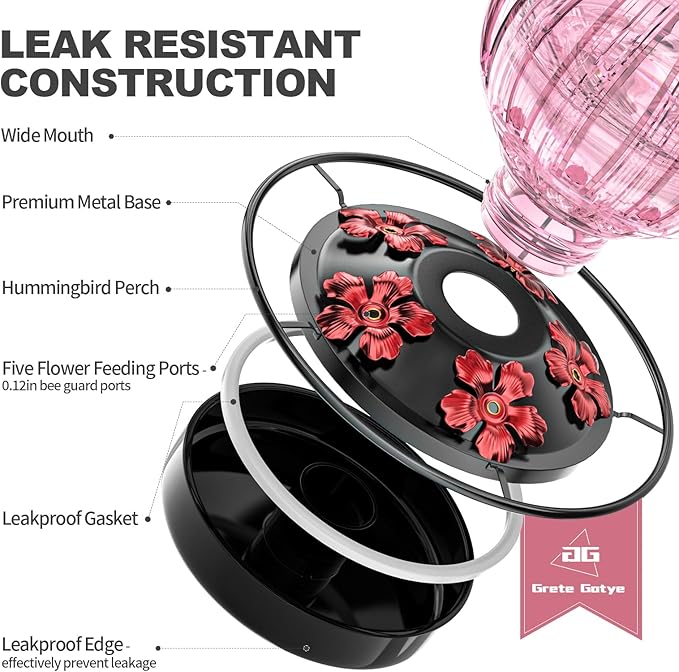 - LEAKPROOF FUNCTION - Build-in durable gasket, unique design makes base connection proper and seamless, even when the hummingbird feeders for outdoors hanging is shaken by wind or birds perching on it. After filling the container and screwing it onto the base, flip it over and hang it on a tree/deck hook/shepherd's hook/hangers/window hook.