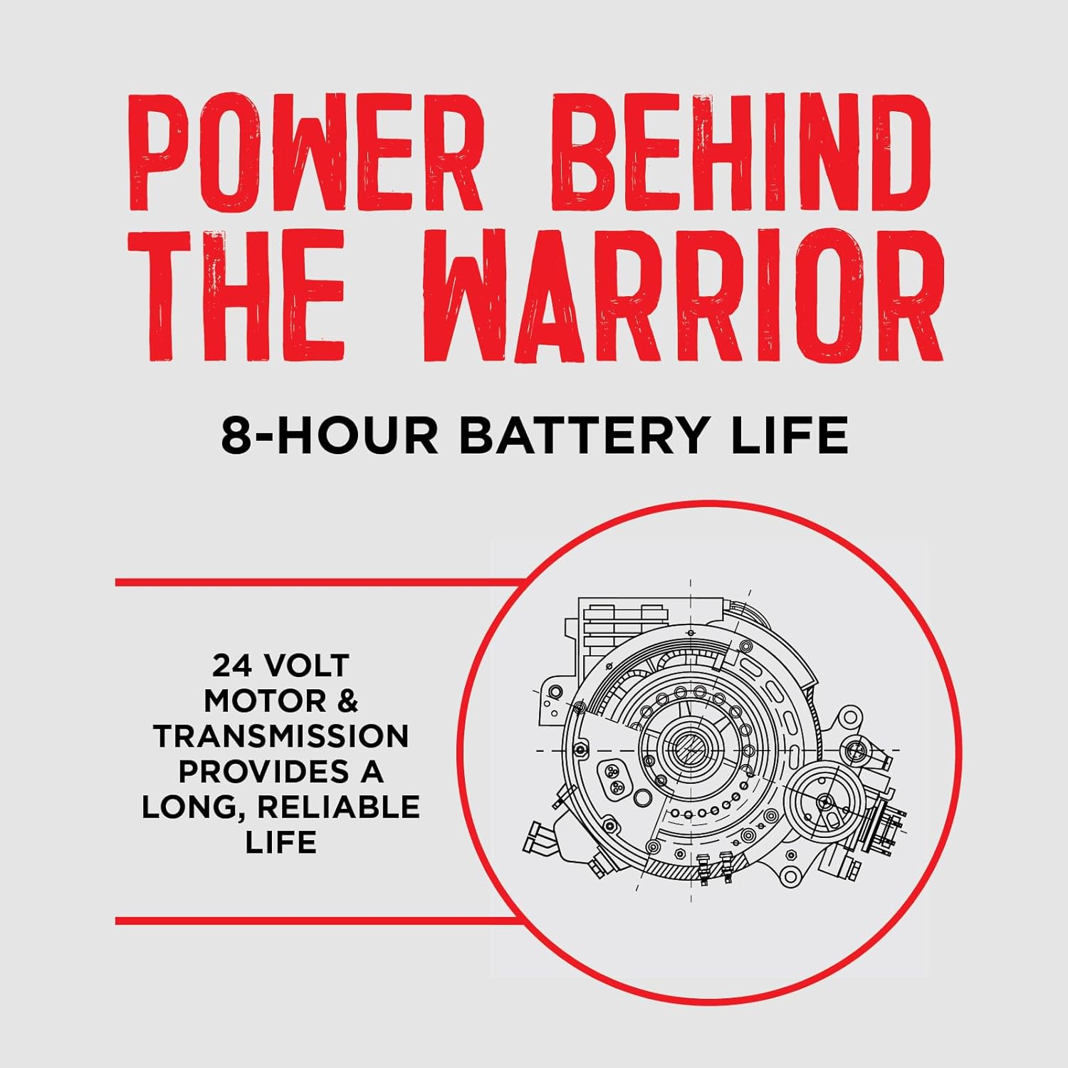 - Battery: Powerful, 24-volt rechargeable battery-operated drive system. Comes with an illuminated battery power level indicator. Use a standard 120v AC outlet to charge. 2 sealed Acid Glass Mat 9Ah batteries.