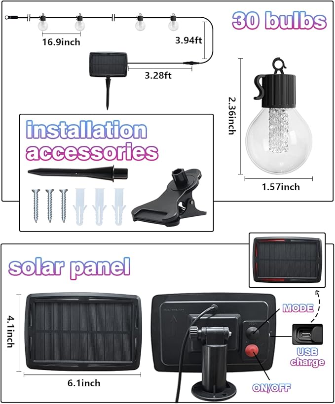- Multicolor & Warm White Outdoor String Lights – 8 Lighting modes, choose between warm white and vibrant multicolor(Can NOT Select a Single Color) LED bulbs to create the perfect atmosphere. With 8 dynamic lighting modes, these solar-powered patio lights bring a festive touch to gardens, pergolas, gazebos, and outdoor events.