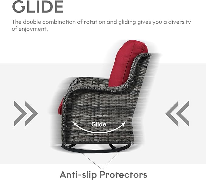 - Comfortable And Easy To Clean: Each glider chair and sofa in this outdoor set comes with a 4-inch thick foam seat cushion and an 8-inch thick cotton back cushion, which is ergonomic and enhances the overall comfort of the chair. The chair cushion cover is made of outdoor professional olefin fabric which is water resistant, and the seat cushion is equipped with zippers that are removable and easy to clean.