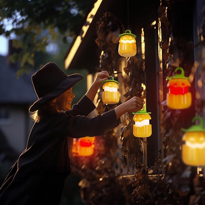 - Lightweight and Portable: The size of the Halloween pumpkin light is 89*89mm, which is lightweight and compact, and you can easily store it in your cabin, backpack. The pumpkin lantern comes with a hook, which can be hung on windows, fireplaces, porches, gardens, trees, bookshelves, stairs, etc. You can also carry it on Halloween night, and it will make your Halloween party stand out