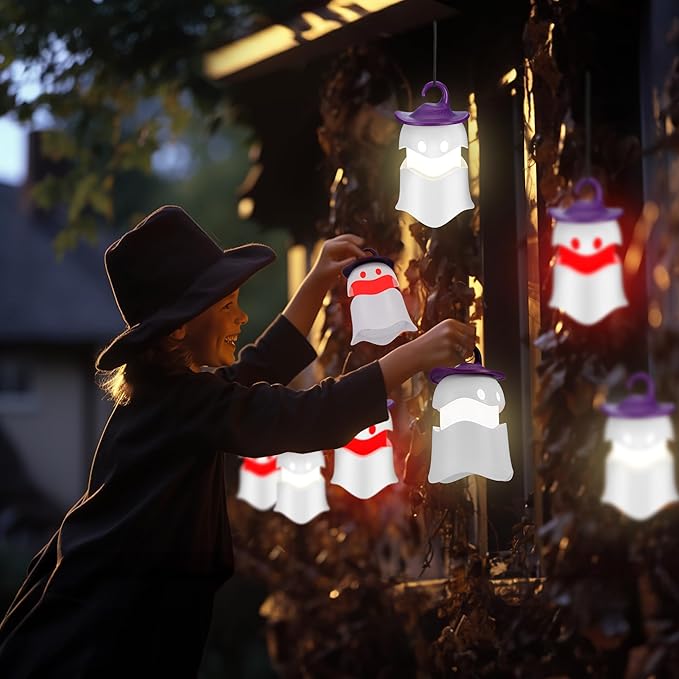 - Lightweight and Portable: The size of the Halloween ghost camping Lantern is 90*90 mm, which is lightweight and compact, and you can easily store it in your cabin, backpack. The ghost camping lantern comes with a hook, which can be hung on windows, fireplaces, porches, gardens, trees, bookshelves, stairs and more to create a spooky and ghostly atmosphere. These frightening ghosts will add a bit of additional fear to trick-or-treaters' night