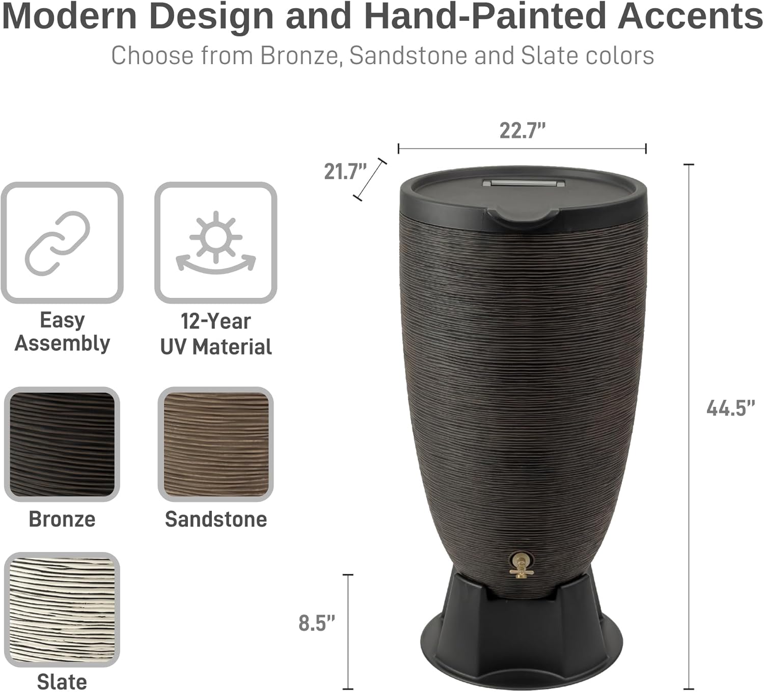 50-Gallon Newport Rain Barrel with Stand and Removable Lid, Bronze Color